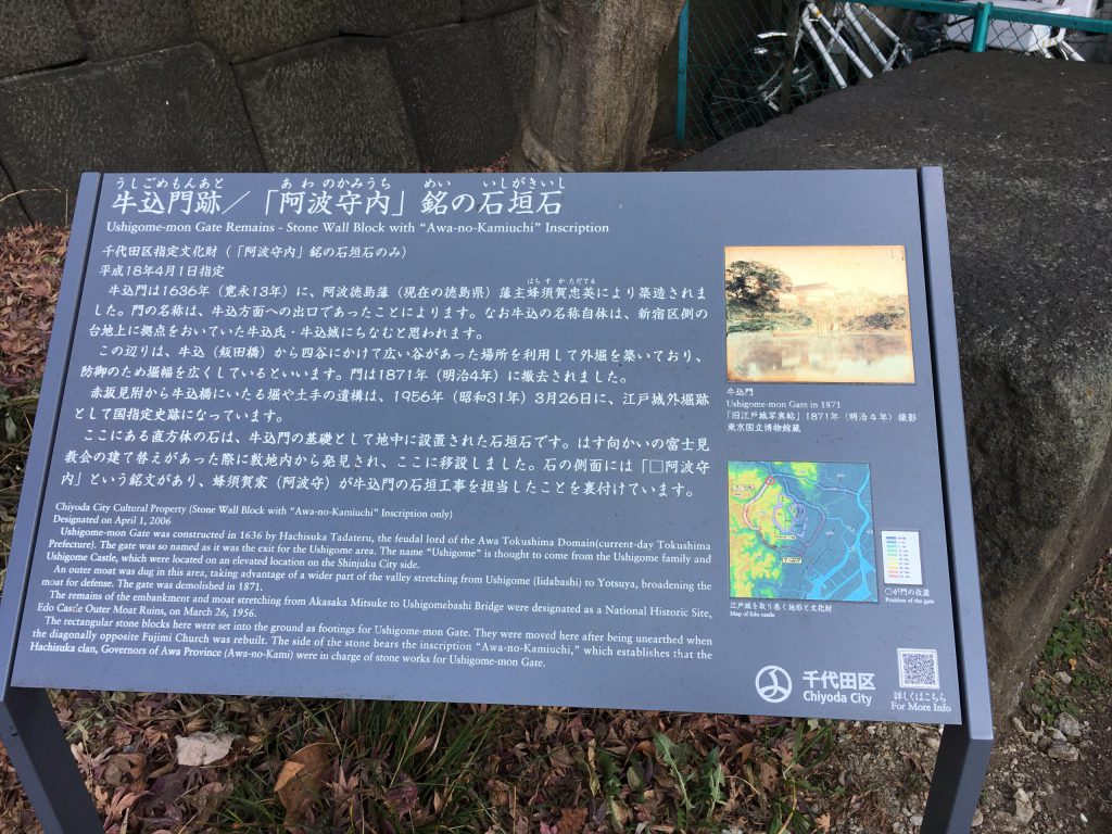 牛込御門は明治四年(1871年)に撤去されました。「阿波守内」という銘文の石垣は、