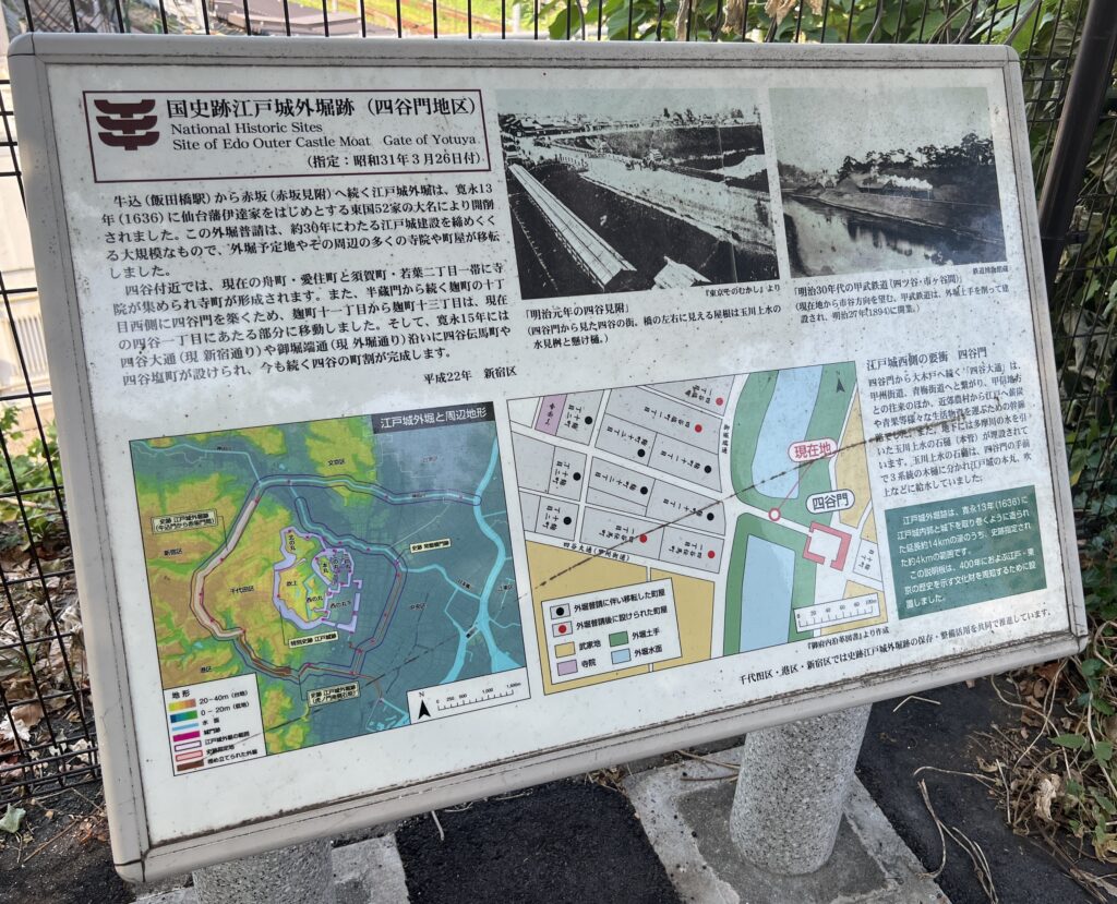 江戸城外堀跡の四谷門周辺は、JR四ツ谷駅のホームにあたります。