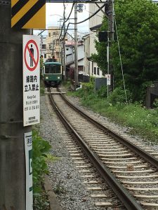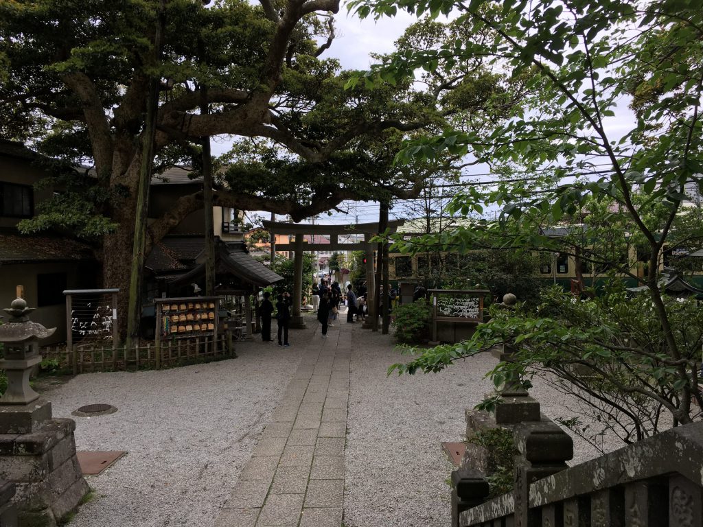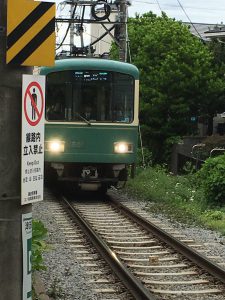 鳥居の前を江ノ電が走っています。絶好の撮影スポットになっています。