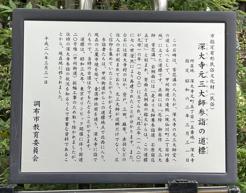 深大寺の元三大師堂の道しるべとして、甲州街道の滝坂に立てた道標です。