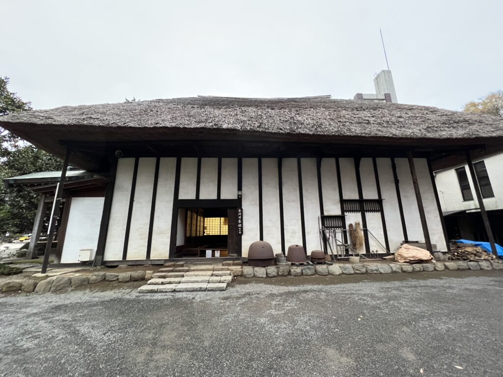 都内では貴重な茅葺き屋根の大建築で、ケヤキの大黒柱や梁の重厚感漂う土間では、
