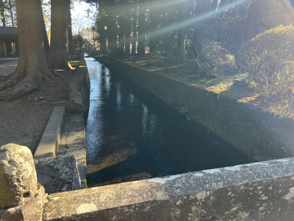 令和七年十二月参拝時は、気温も低く、西宮本殿前水盤にはぶ厚い氷が張っていました。