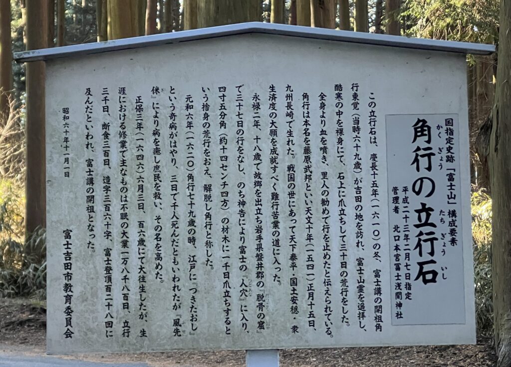 この立行石は、慶長十五年(1610年)富士講の開祖角行東覚吉田の地を訪れ、