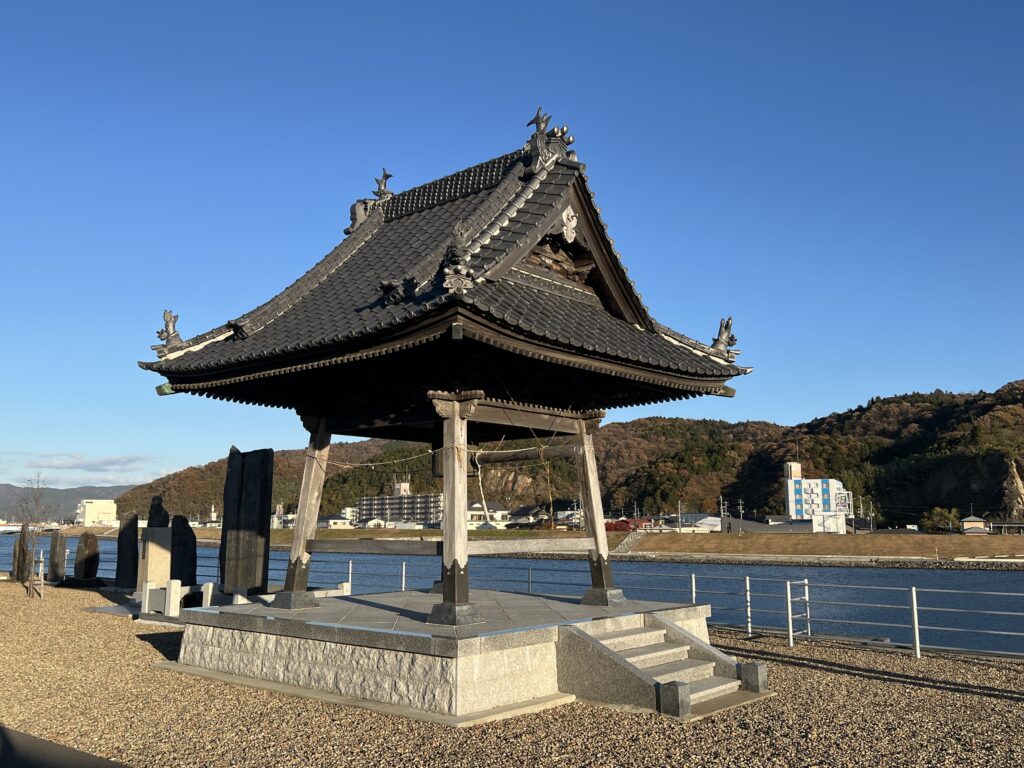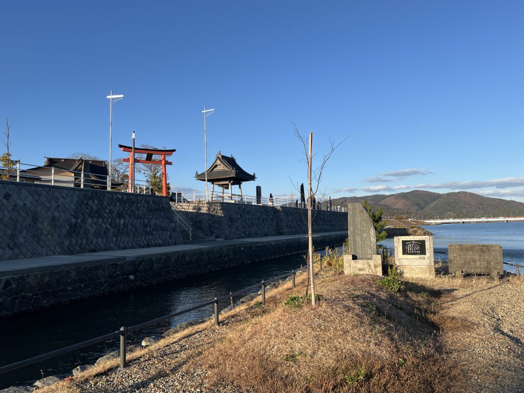 石碑のある雄島のそばに赤い鳥居の神社鐘楼堂が見えます。