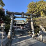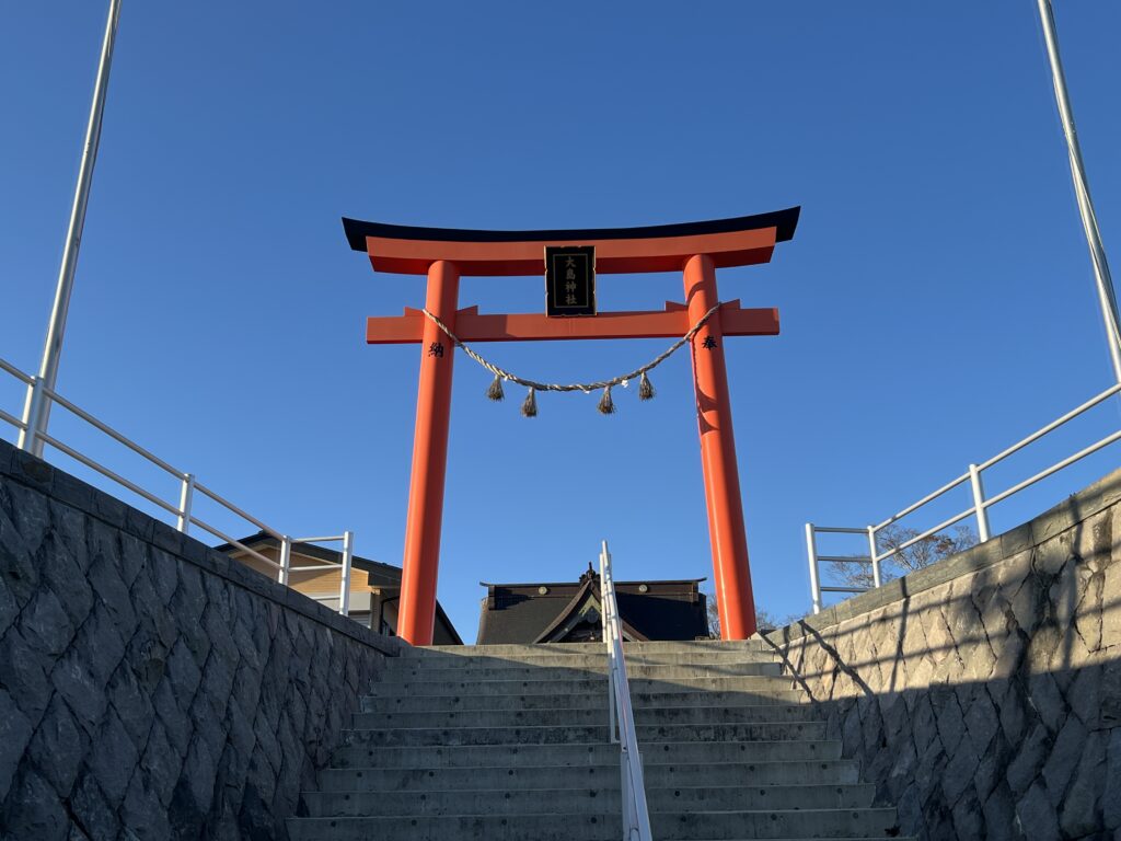 巻石のそばに赤い鳥居があり、「大島神社」と書かれた扁額がありました。