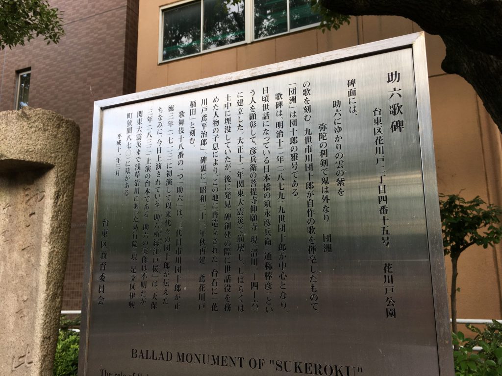 花川戸公園にある、九世市川團十郎が自作の歌を揮毫した歌碑です。