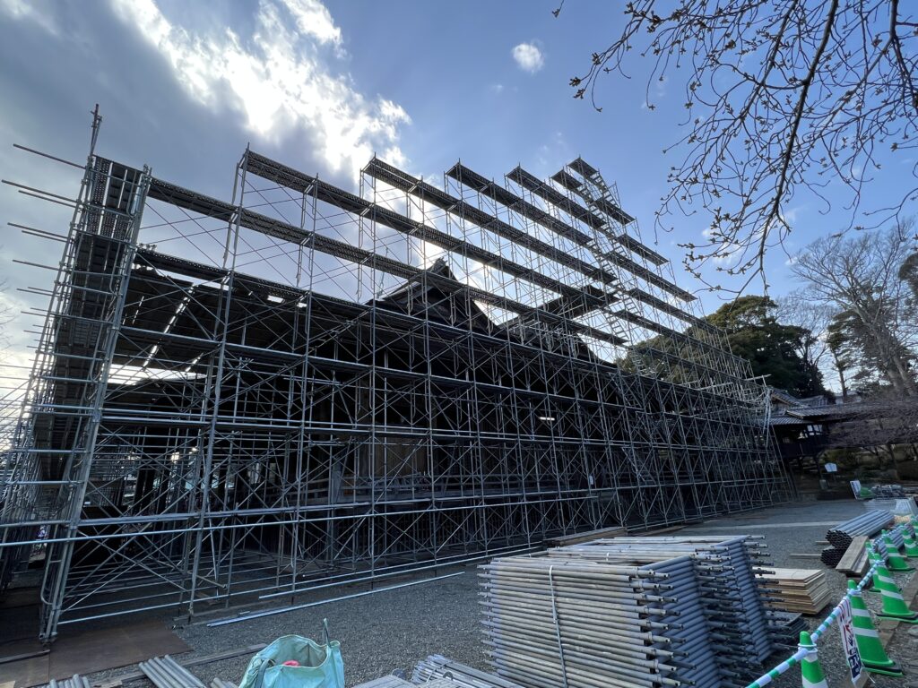屋根を二つ並べたような比翼入母屋造(ひよくいりもやづくり)の形式を持つのが特徴です。