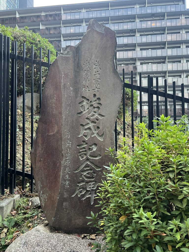 浅間神社の境内にあり、富士塚の山頂にも浅間神社奥宮が設けられています。