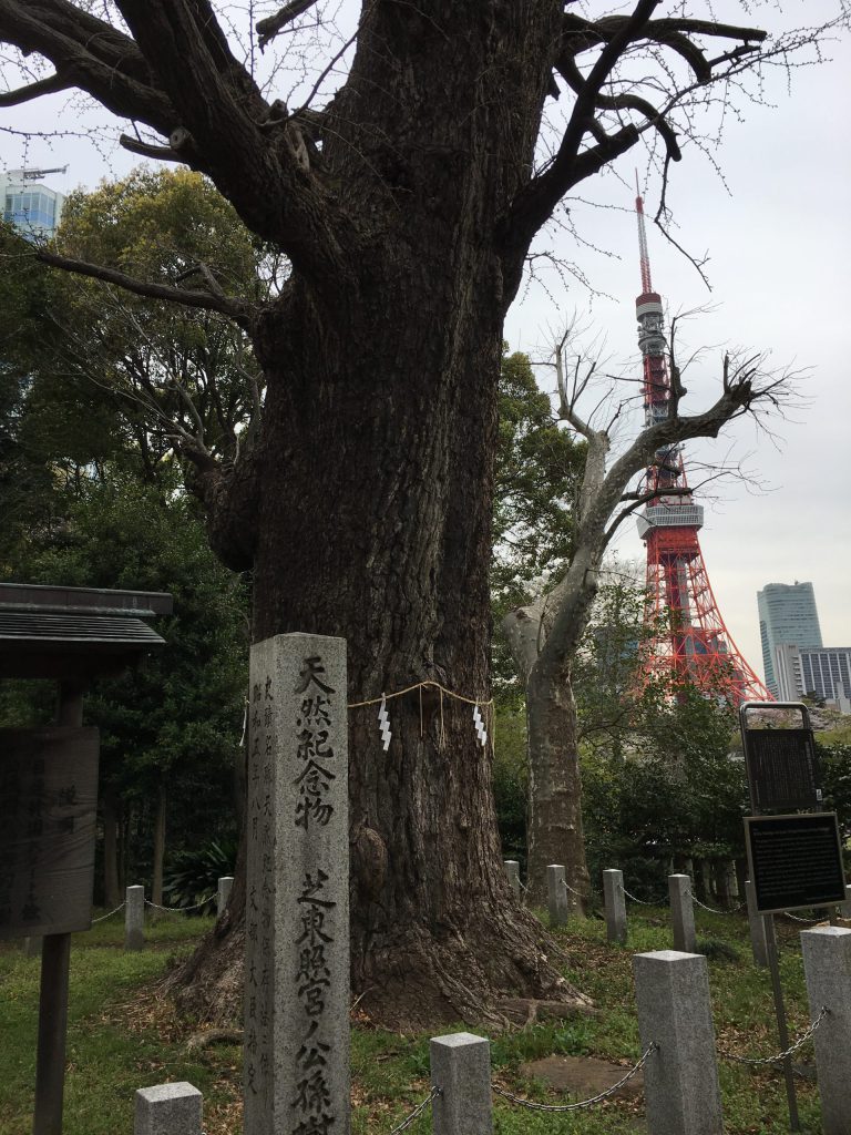 社殿の後ろはザ・プリンスパークタワー東京東京タワーがあります。