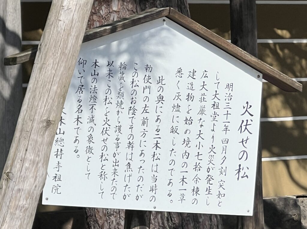 この松のお陰で輪蔵を類焼から護ることが出来たことから、この松を火伏せの松と称します。